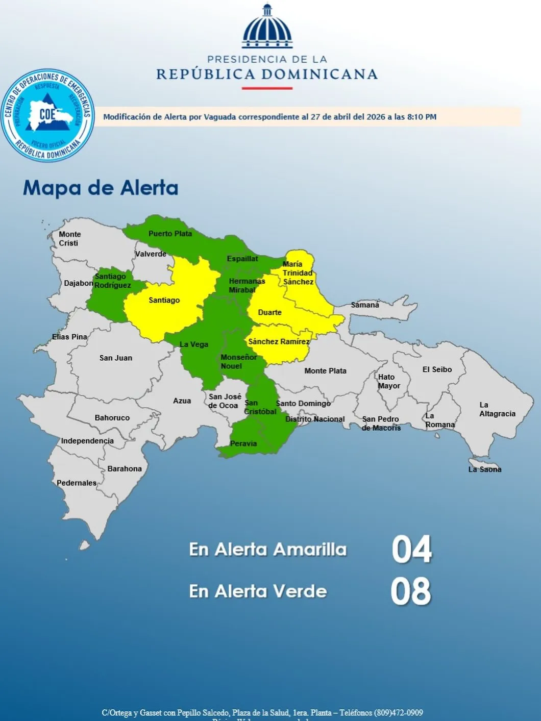 En nivel de alerta verde continúan Santiago Rodríguez, Puerto Plata, Espaillat, Hermanas Mirabal, Peravia, San Cristóbal, Monseñor Nouel y Juan Sánchez Ramírez.